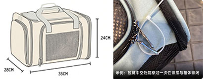 2.必须选用带有拉链的软质宠物箱,且拉链中空处能穿过一次性锁扣与箱体锁闭,确保锁闭后拉链无法拉开。软质宠物箱所有拉链处,全部拴挂一次性锁扣,确保拉链头无法拉开,以防旅客私自打开。如拉链无法有效穿过一次性锁扣锁闭、固定住的,则应予以拒运。在此基础上,在宠物箱外侧加套一层宠物防护网兜,并在网兜打结处再次栓挂一次性锁扣。从办理乘机手续结束起至离开目的站候机楼禁止打开一次性锁扣和网兜。