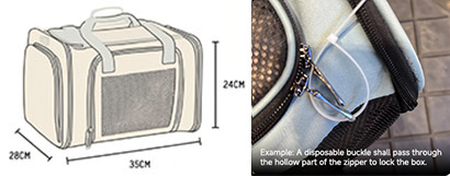 3.A soft pet carrier with a zipper must be selected, and a disposable buckle shall pass through the hollow part of the zipper to lock the box so that the zipper cannot be pulled open after locking. All zippers of the soft pet carrier shall be attached with a disposable buckle to ensure that the zipper heads cannot be opened and prevent the passenger from opening them without authorization. If any zipper cannot pass through the disposable buckle effectively for locking and fixation, it shall be rejected for transportation. On this basis, a protective pet net bag shall be added to the exterior of the pet carrier, and another disposable buckle shall be attached to the knot of the net bag. From the time when the check-in procedure is completed to the time when the passenger leaves the terminal of the destination airport, the disposable buckle and the net bag shall not be opened.